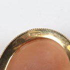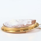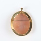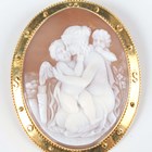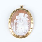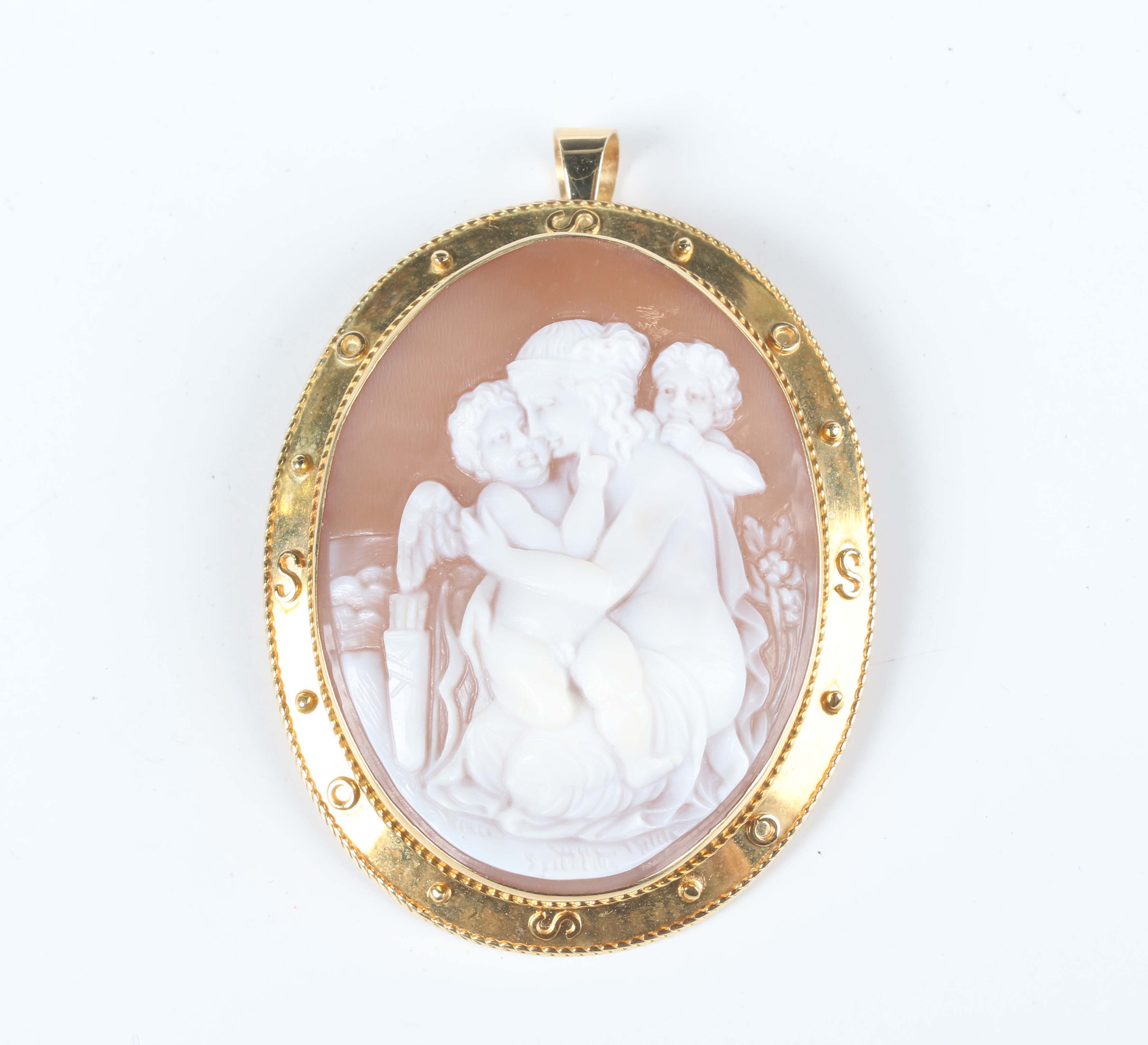 A gold mounted oval shell cameo pendant brooch, carved with a classical scene of a maiden embracing Cupid with a child looking over her shoulder, indistinctly signed, weight 21.5g, length 6.3cm, width 4.7cm.