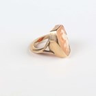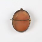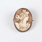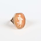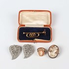 A gold and shell cameo ring, designed as a classical figure, unmarked, weight 4.1g, ring size approx F, a base metal mounted oval shell cameo brooch, a gilt metal brooch in the form of a trumpet, width 5cm, cased, and a pair of colourless paste dress clips of foliate form.