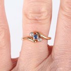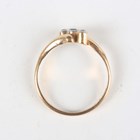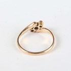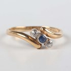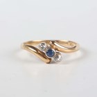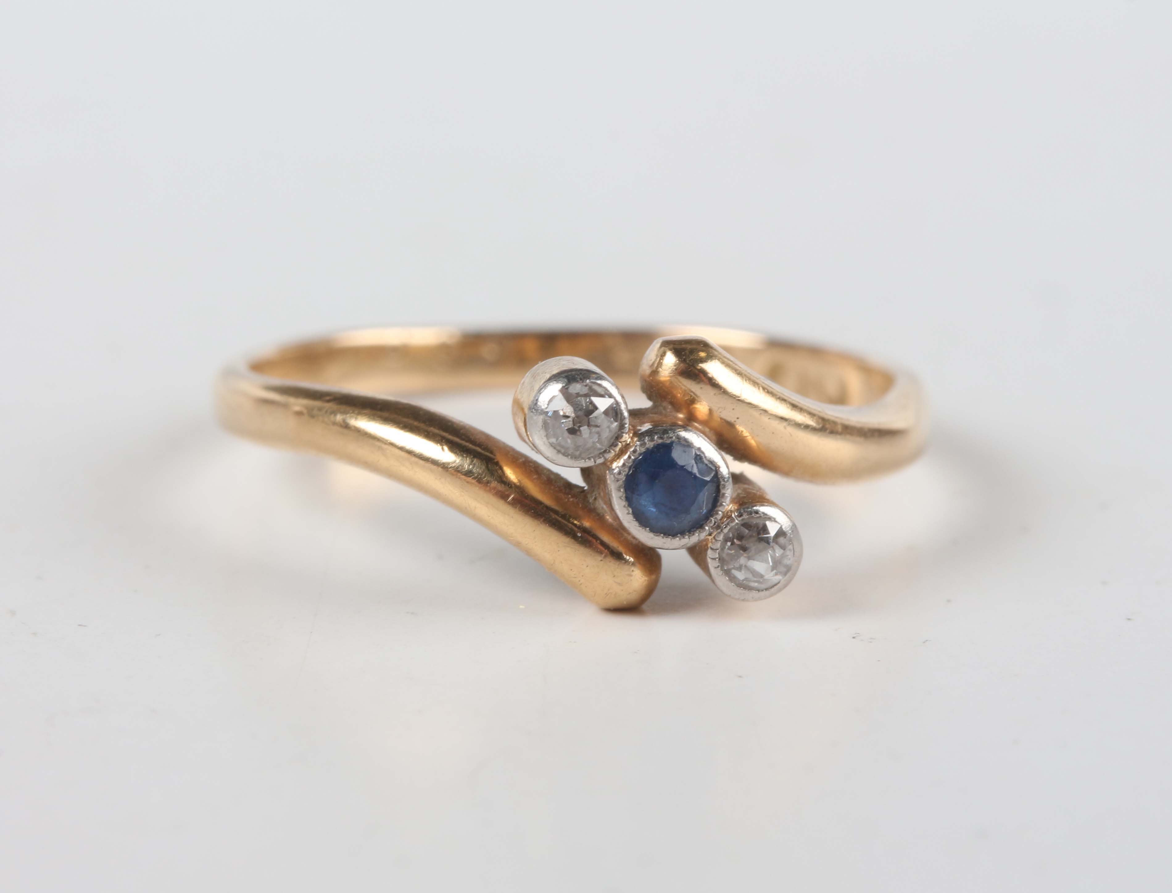 A gold, sapphire and diamond three stone ring, collet set with a cushion shaped sapphire between two cushion shaped diamonds, detailed ‘18ct’, weight 2.3g, ring size approx M.