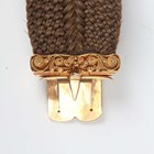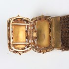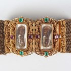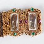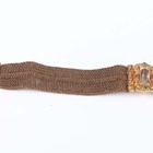 A Victorian gold, emerald and pink gem set mounted woven hairwork mourning bracelet, the front with two glazed hairwork locket compartments, each framed within filigree and gem set surrounds, on a snap clasp, unmarked, weight 26.9cm, total length 15.7cm, length of clasp 4.7cm.