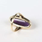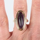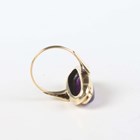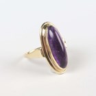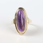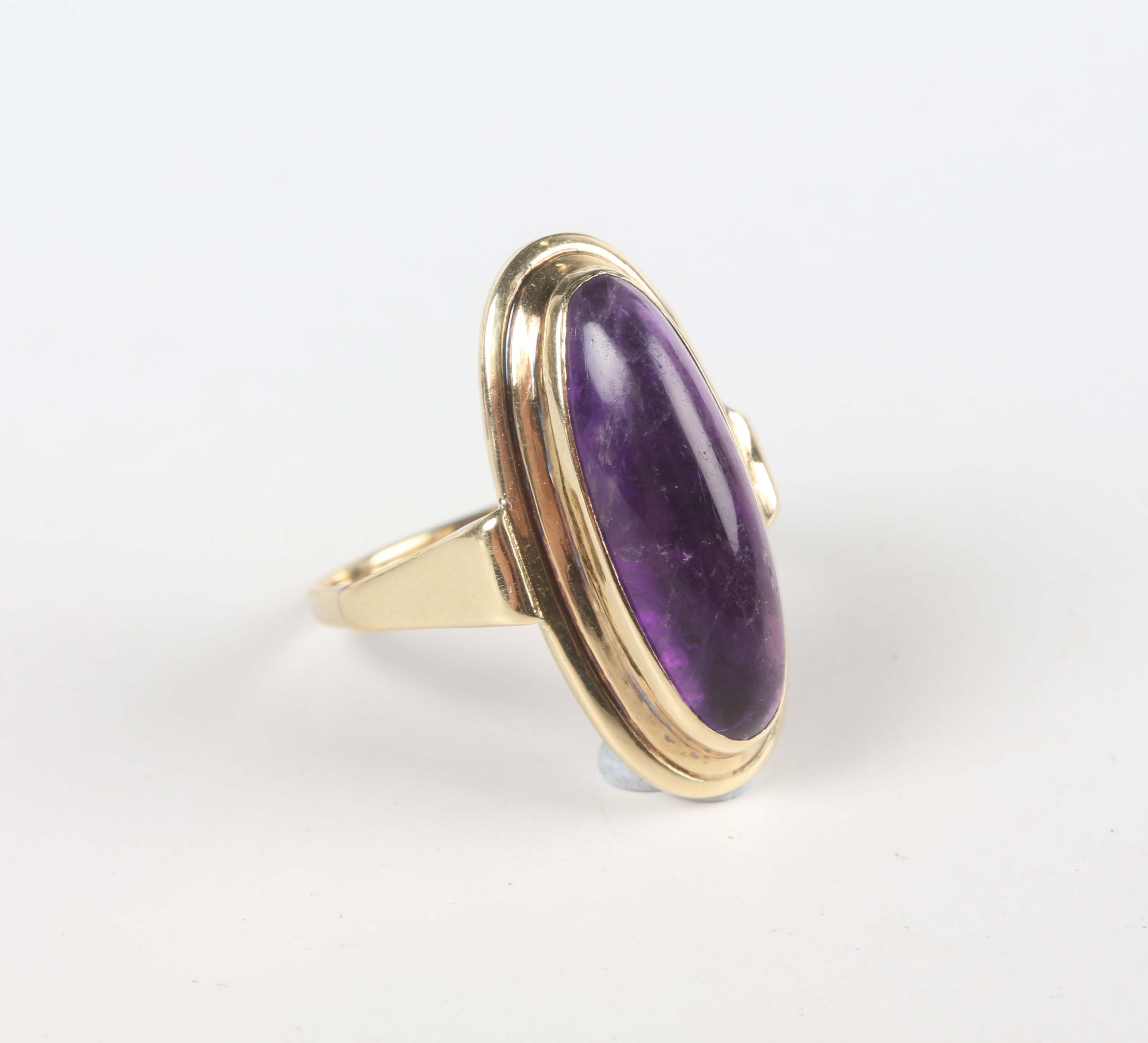 A gold and amethyst single stone ring, the oval cabochon amethyst within a stepped surround, detailed '585', weight 4.8g, ring size approx P.
