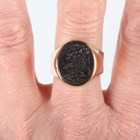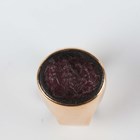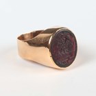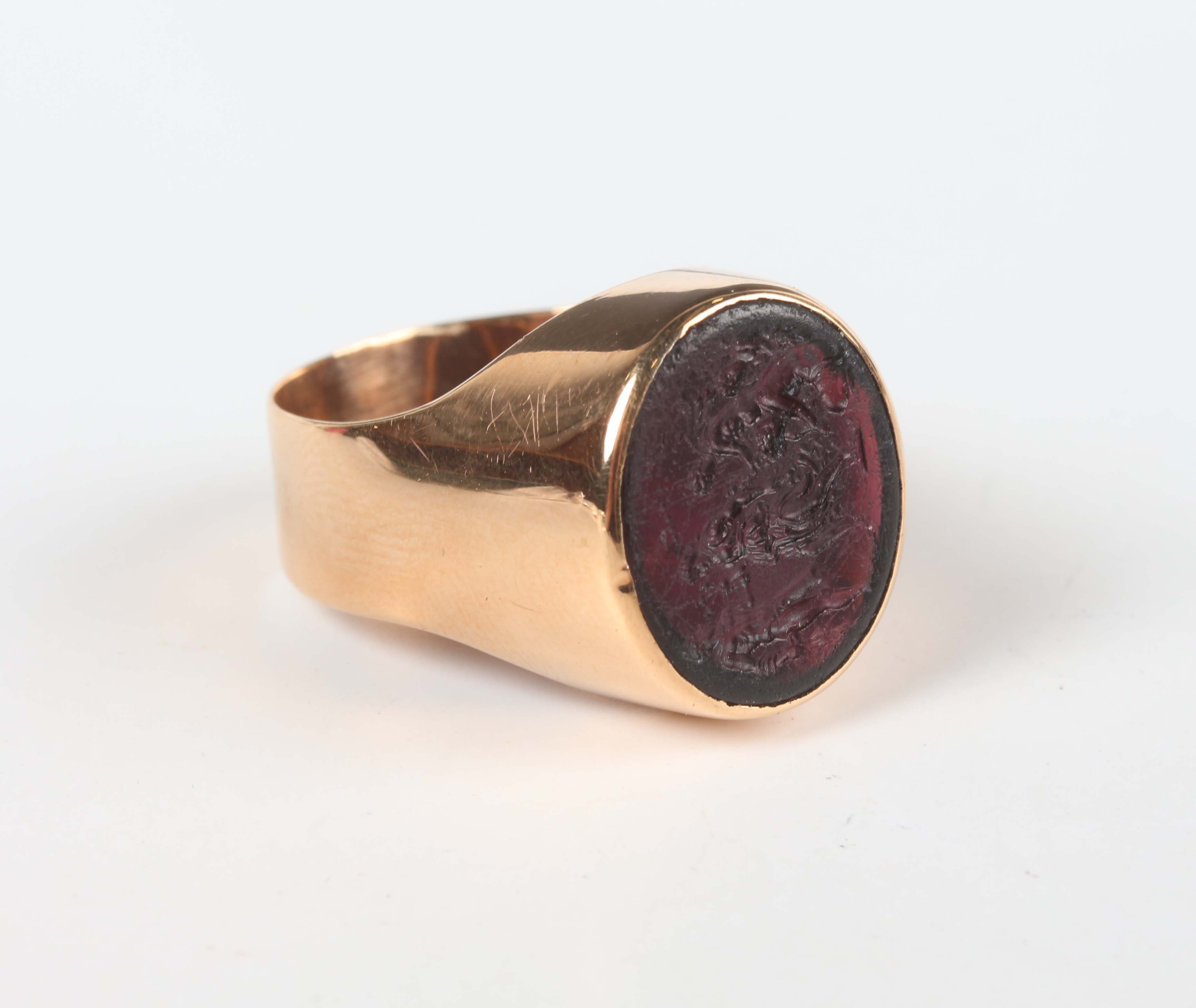 A gold and amethyst intaglio ring, carved with a classical scene of three figures, detailed '9ct', weight 6.6g, ring size approx S1/2.