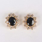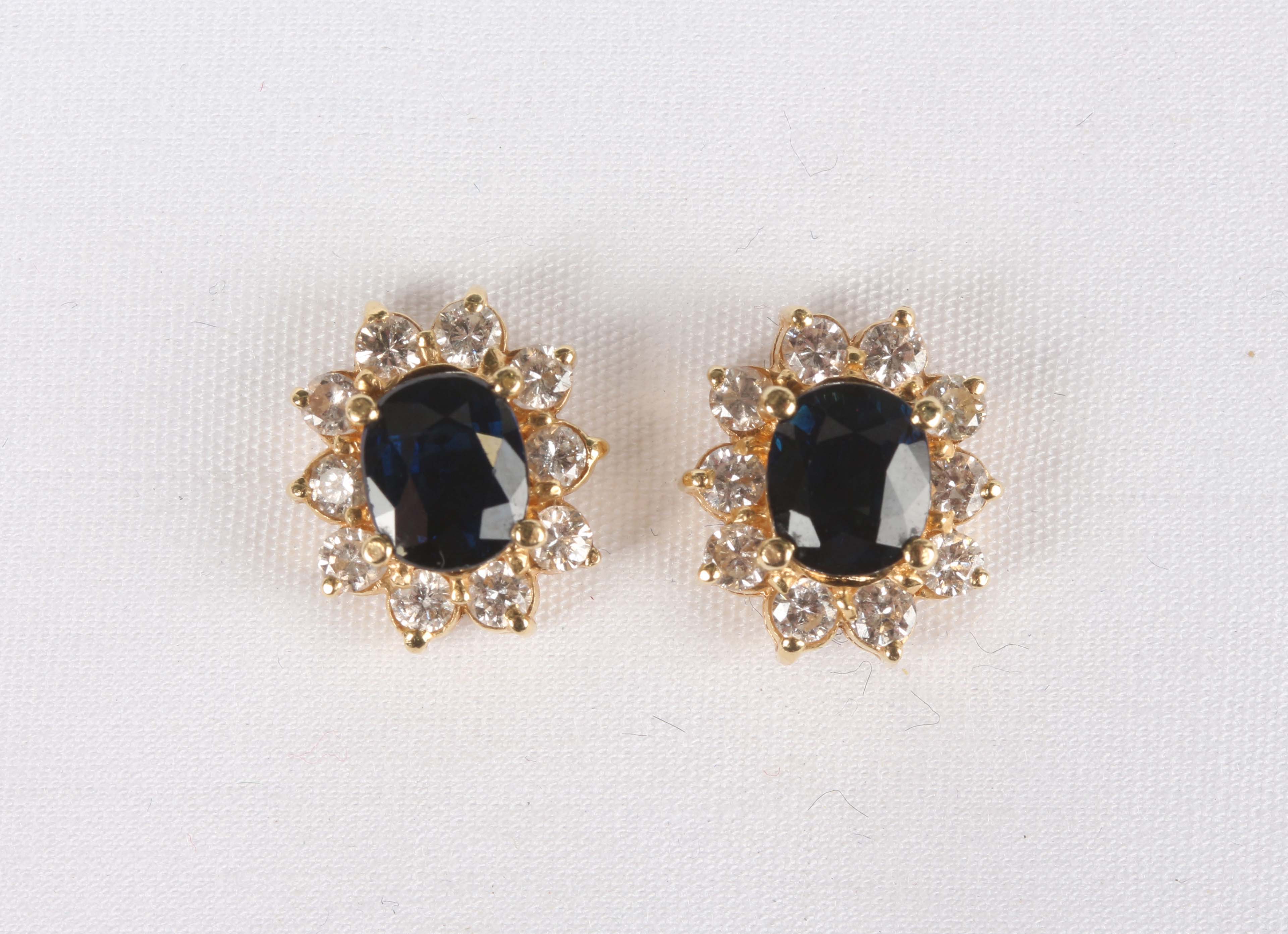 A pair of gold, sapphire and diamond oval cluster earstuds, each claw set with the oval cut sapphire within a surround of ten circular cut diamonds, with post fittings, unmarked, weight 3.4g, and associated butterflies, detailed ‘375’.