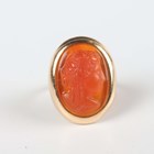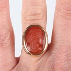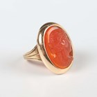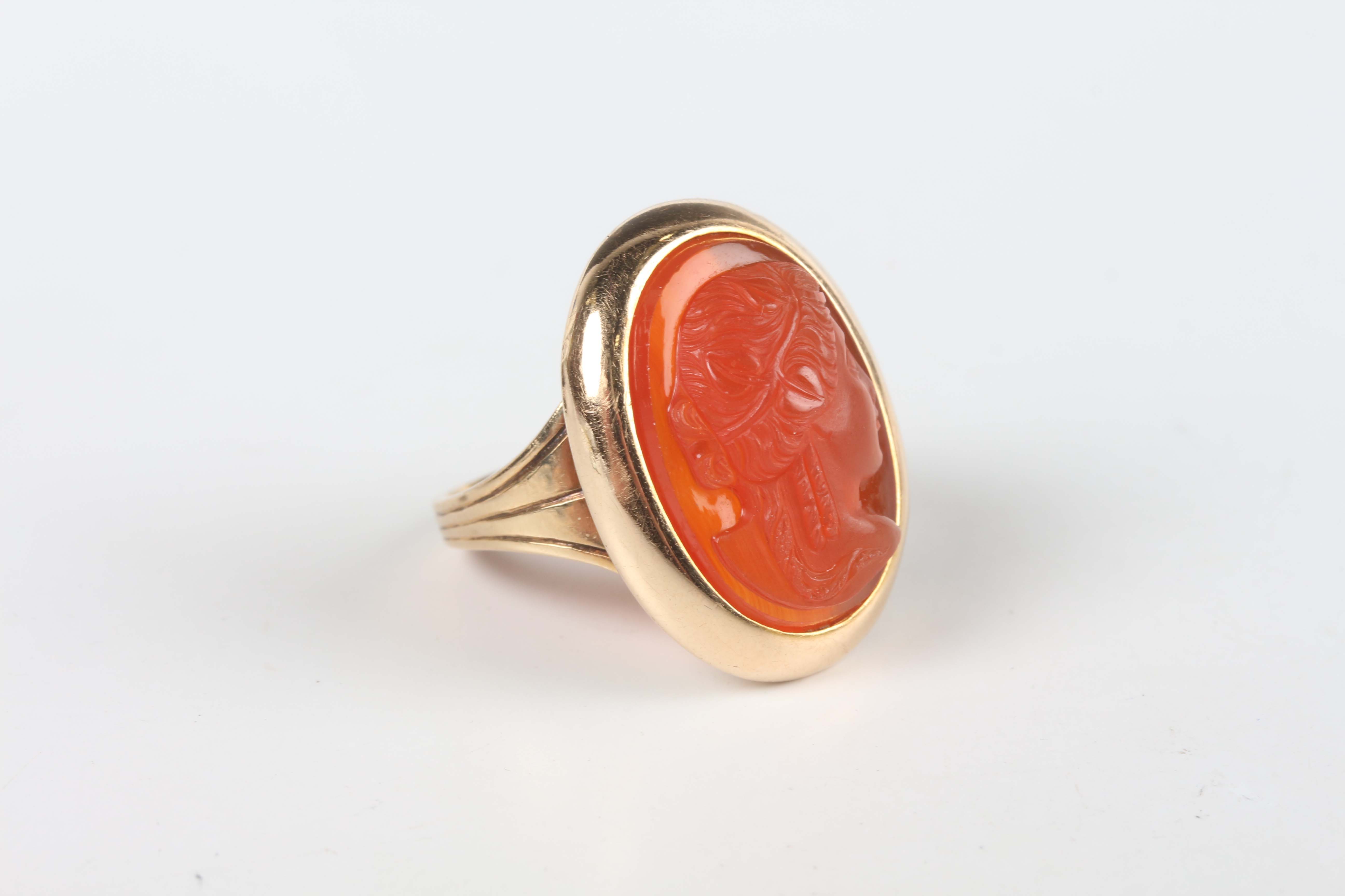 A gold and agate cameo ring, carved with a profile bust portrait of a young lady, unmarked, weight 5.5g, ring size approx L.