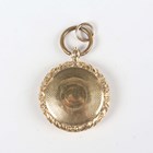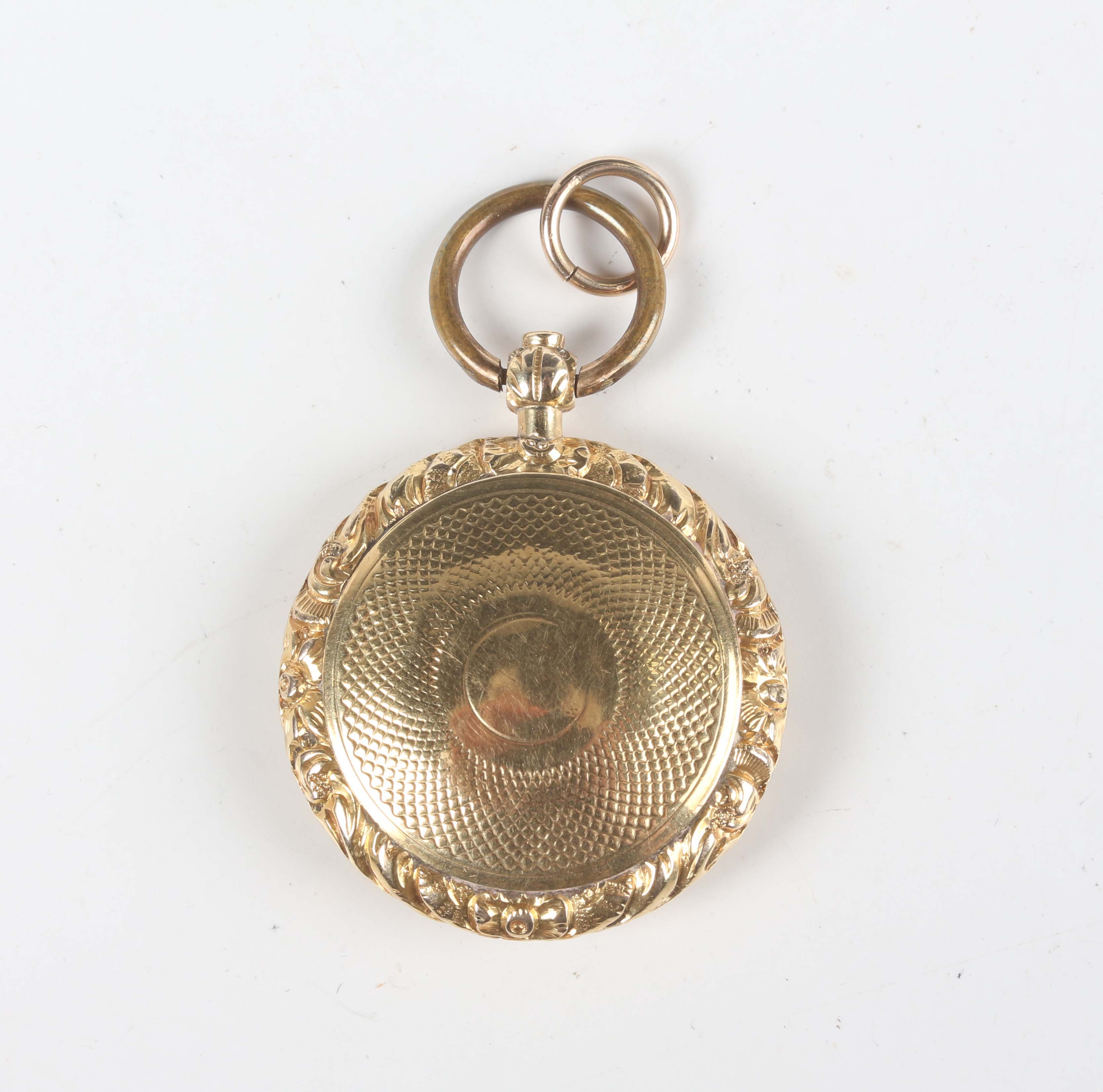 A Victorian gold cased circular pendant locket, the back engine turned within a floral moulded border, glazed to the front, weight 8.6g, length 4.2cm.
