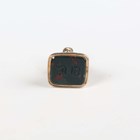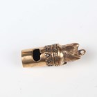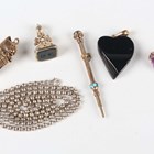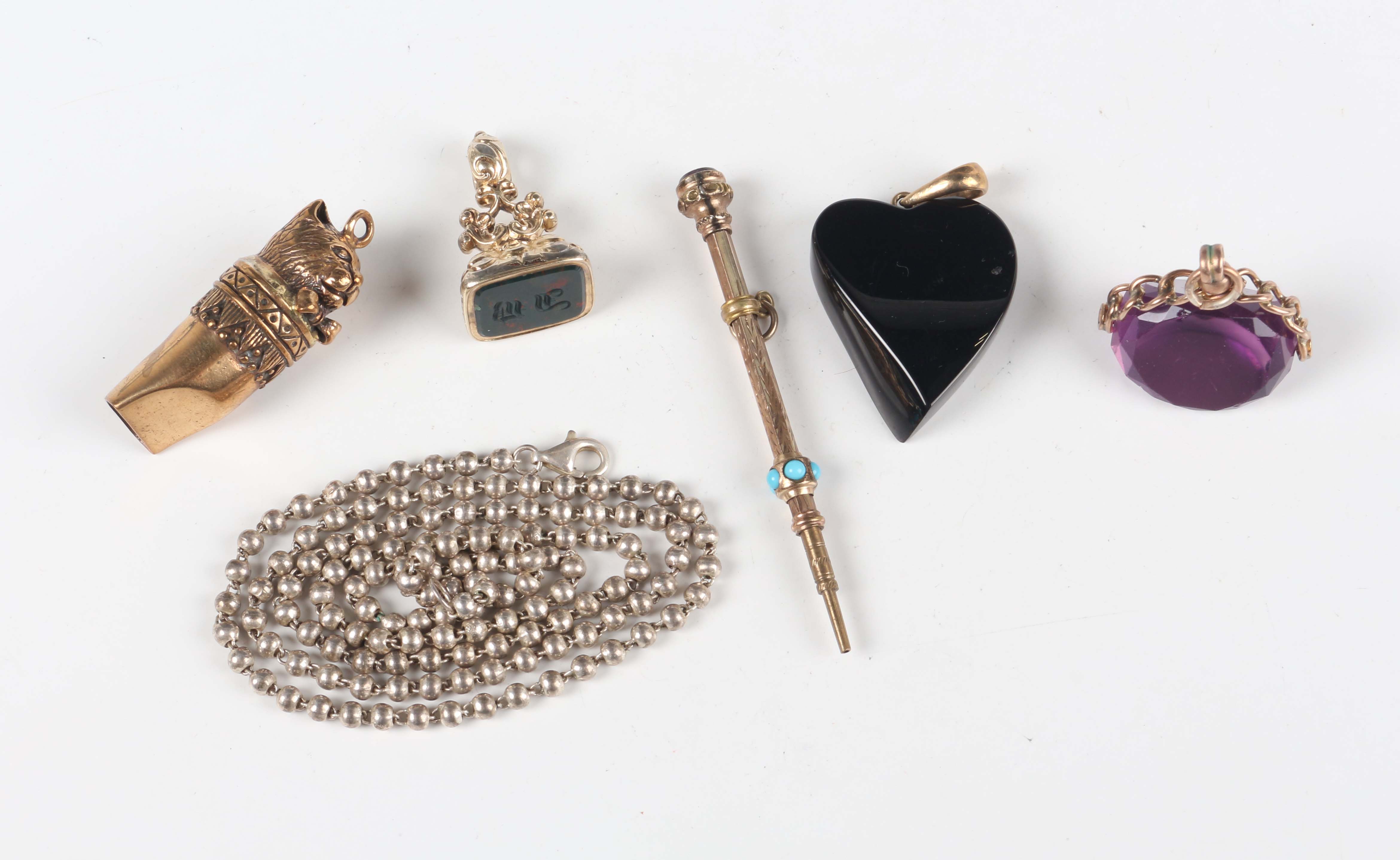 A 9ct gold mounted black composition heart shaped pendant, length 4cm, a Victorian paste set slide action pencil, a bloodstone set fob seal, initial engraved, height 2.5cm, a mauve paste and gilt metal rotating fob seal, a silver bead link neckchain, length 53cm, and a reproduction whistle with cat terminal, height 3.6cm.