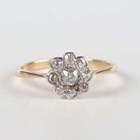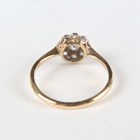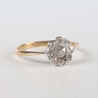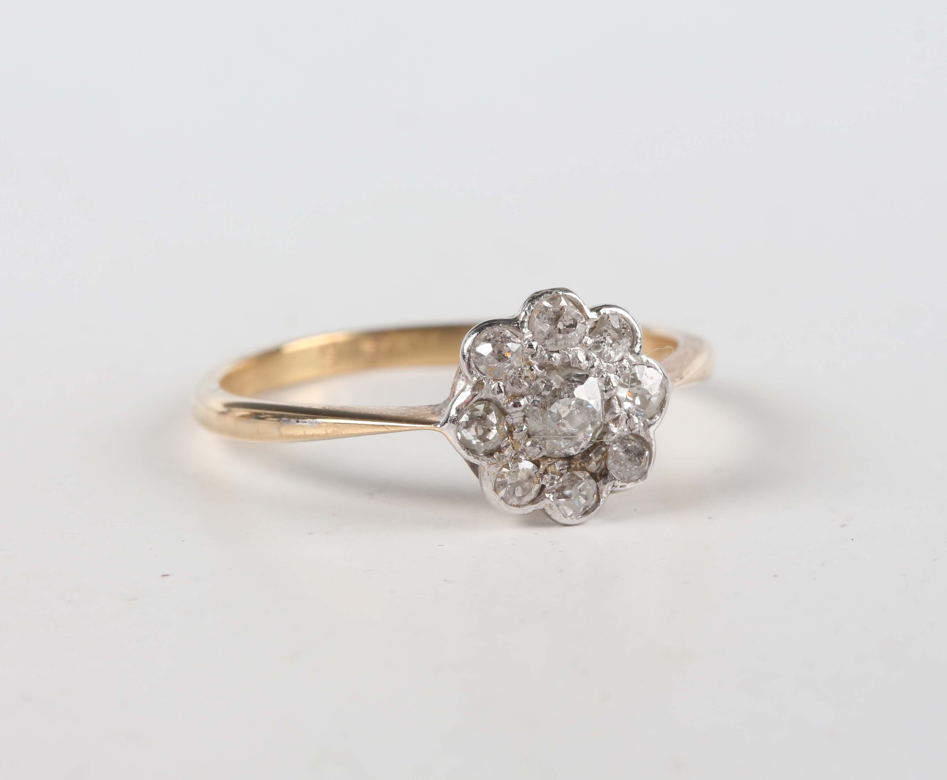 A gold and diamond nine stone cluster ring, mounted with the principal cushion shaped diamond within a surround of eight smaller cushion shaped diamonds, detailed ‘18ct’, weight 1.8g, ring size approx M1/2.