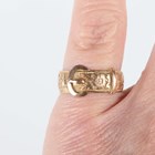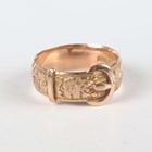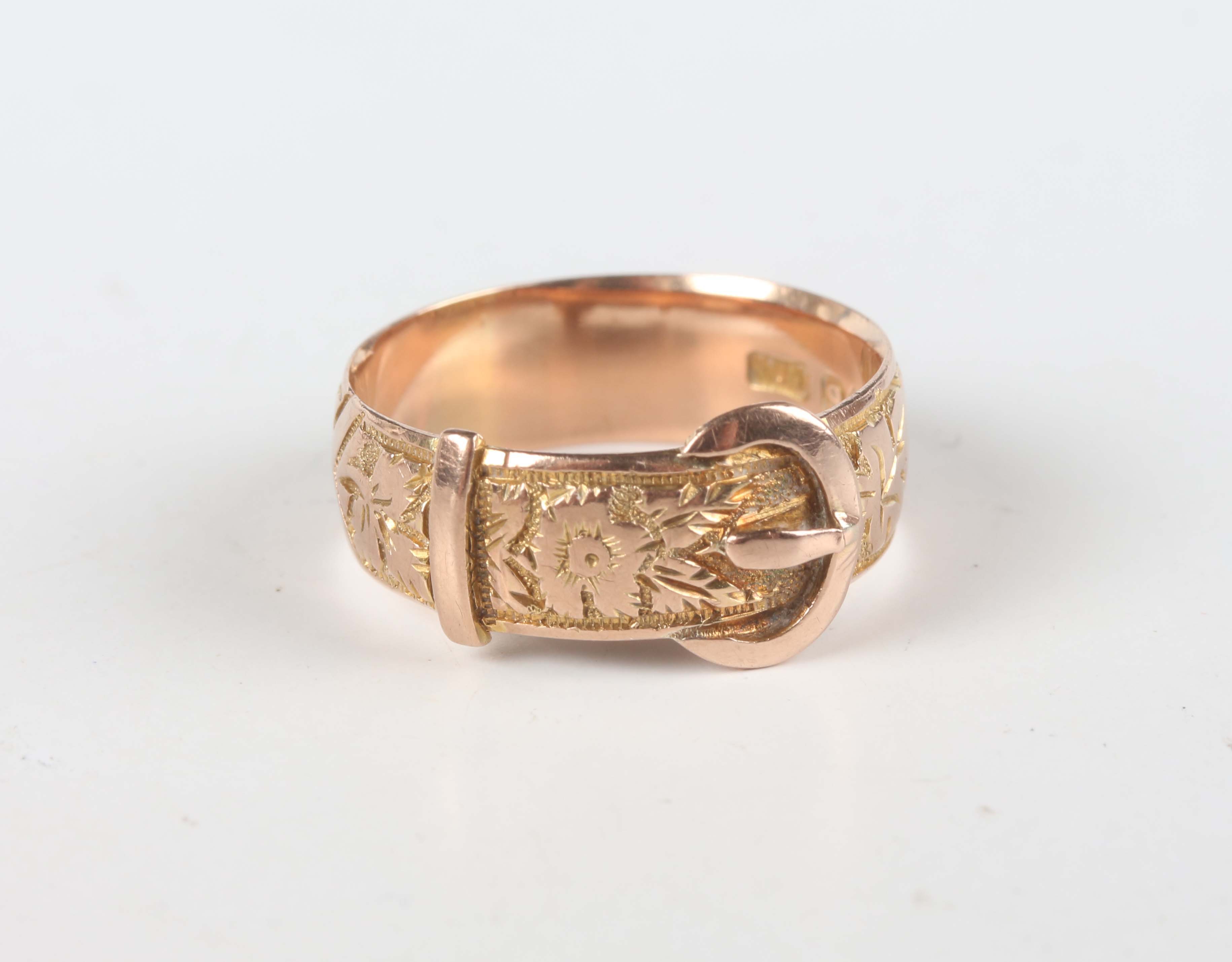 A Victorian 9ct gold ring in a buckle and strap design with floral and foliate decoration, Birmingham 1893, weight 3.3g, ring size approx M.