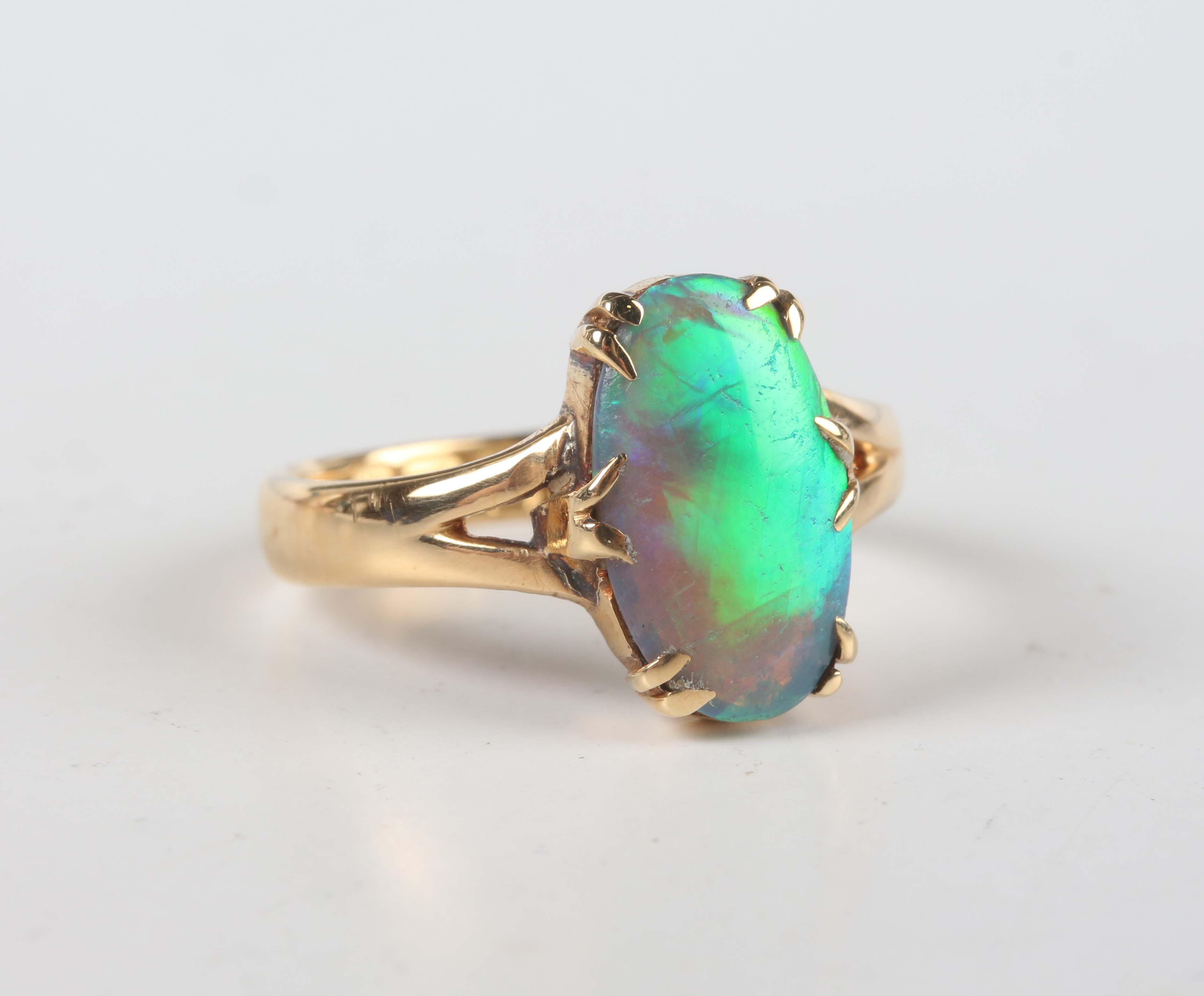 An 18ct gold ring, claw set with an oval opal, Birmingham 1919, weight 3.3g, ring size approx M, with a case.
