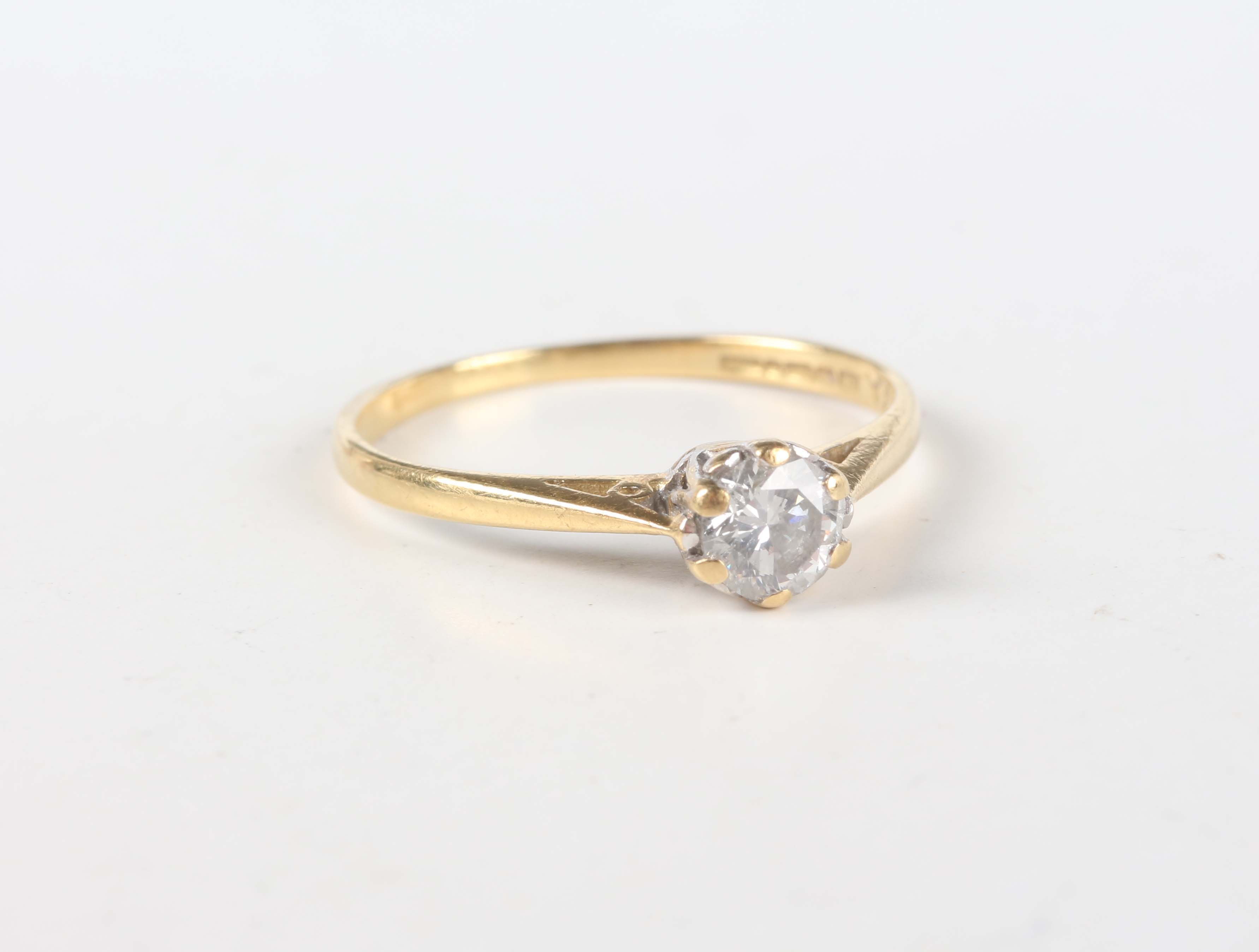 An 18ct gold and diamond single stone ring, claw set with a circular cut diamond, detailed ‘.33’, weight 2g, ring size approx N.