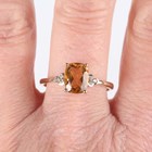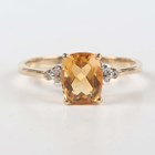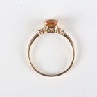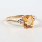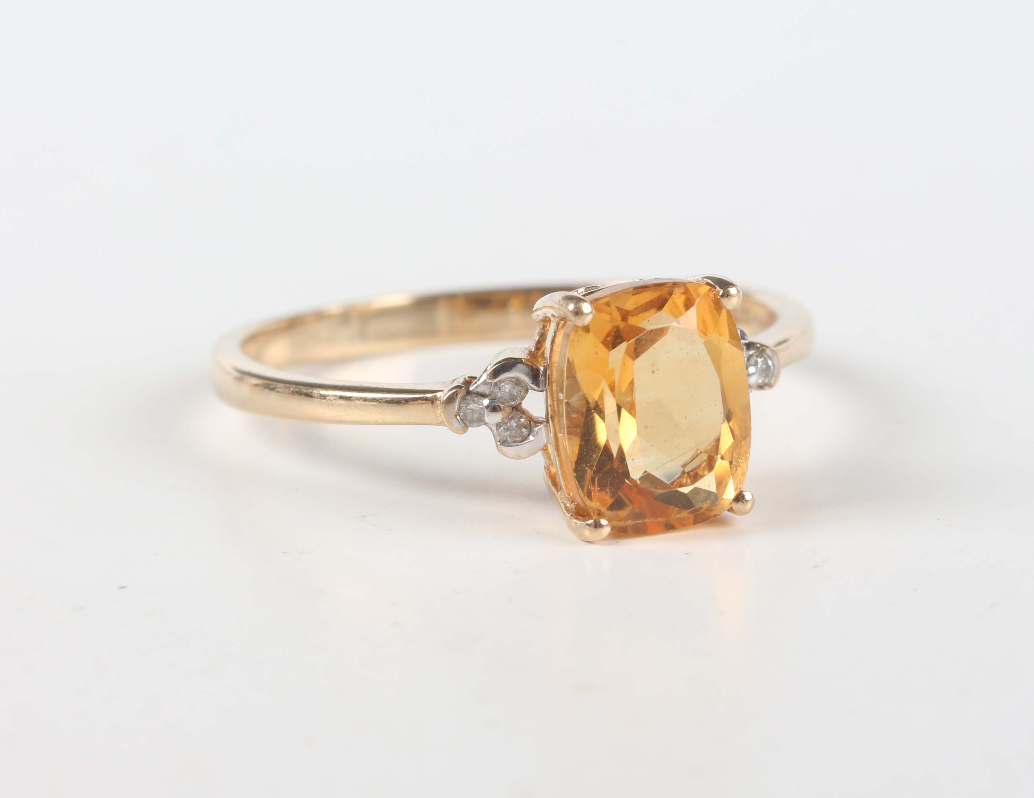 A gold ring, claw set with an oval cut citrine between diamond three stone shoulders, detailed ‘375’, weight 2.5g, ring size approx U1/2.
