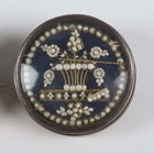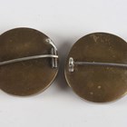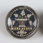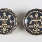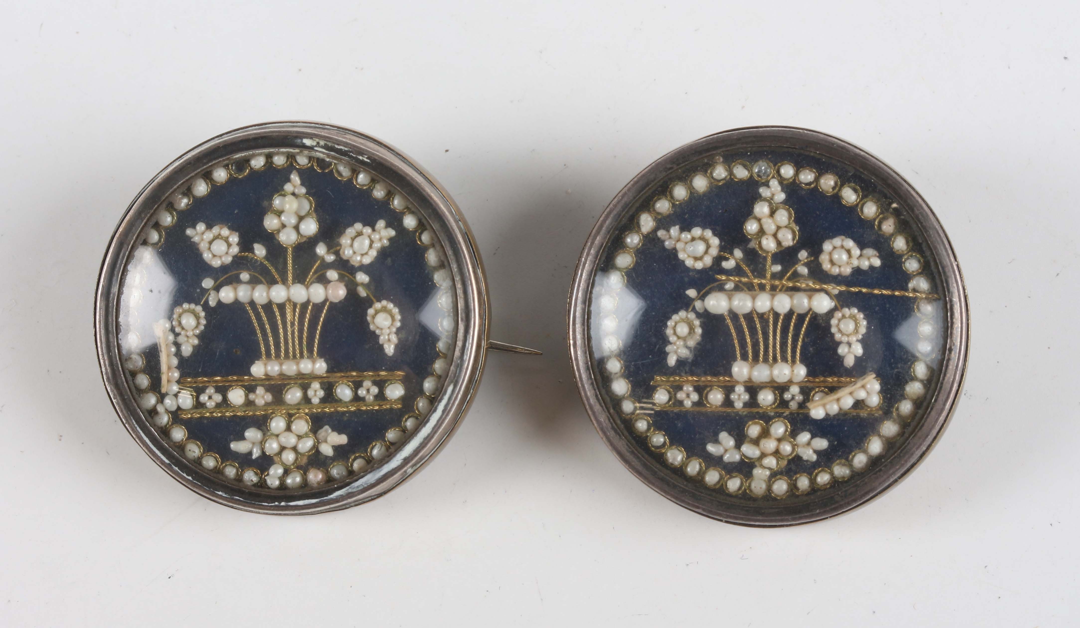 A pair of 19th century silver fronted and brass backed circular brooches, possibly French, each glazed front mounted with seed pearls in a flower charged urn design, diameter 3cm (some seed pearls loose).