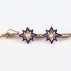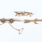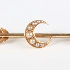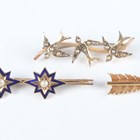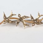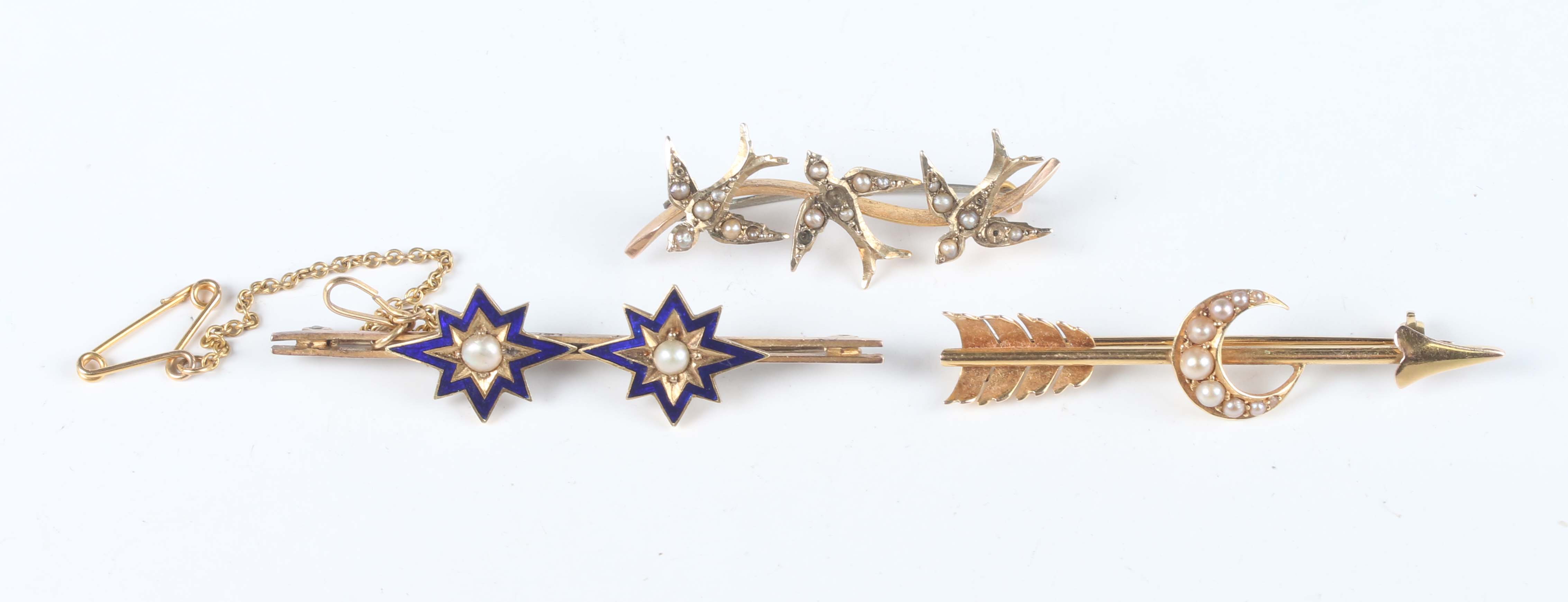 A group of three brooches, comprising a gold and half-pearl brooch, designed as a crescent and arrow, width 4.7cm, a gold, blue enamel and half-pearl brooch with two starburst motifs, detailed ‘9ct’, width 5.1cm, and a 9ct gold and seed pearl brooch, designed as a row of three swallows, Birmingham 1910, width 3.7cm, total weight 8.3g.