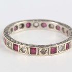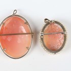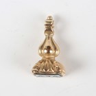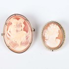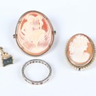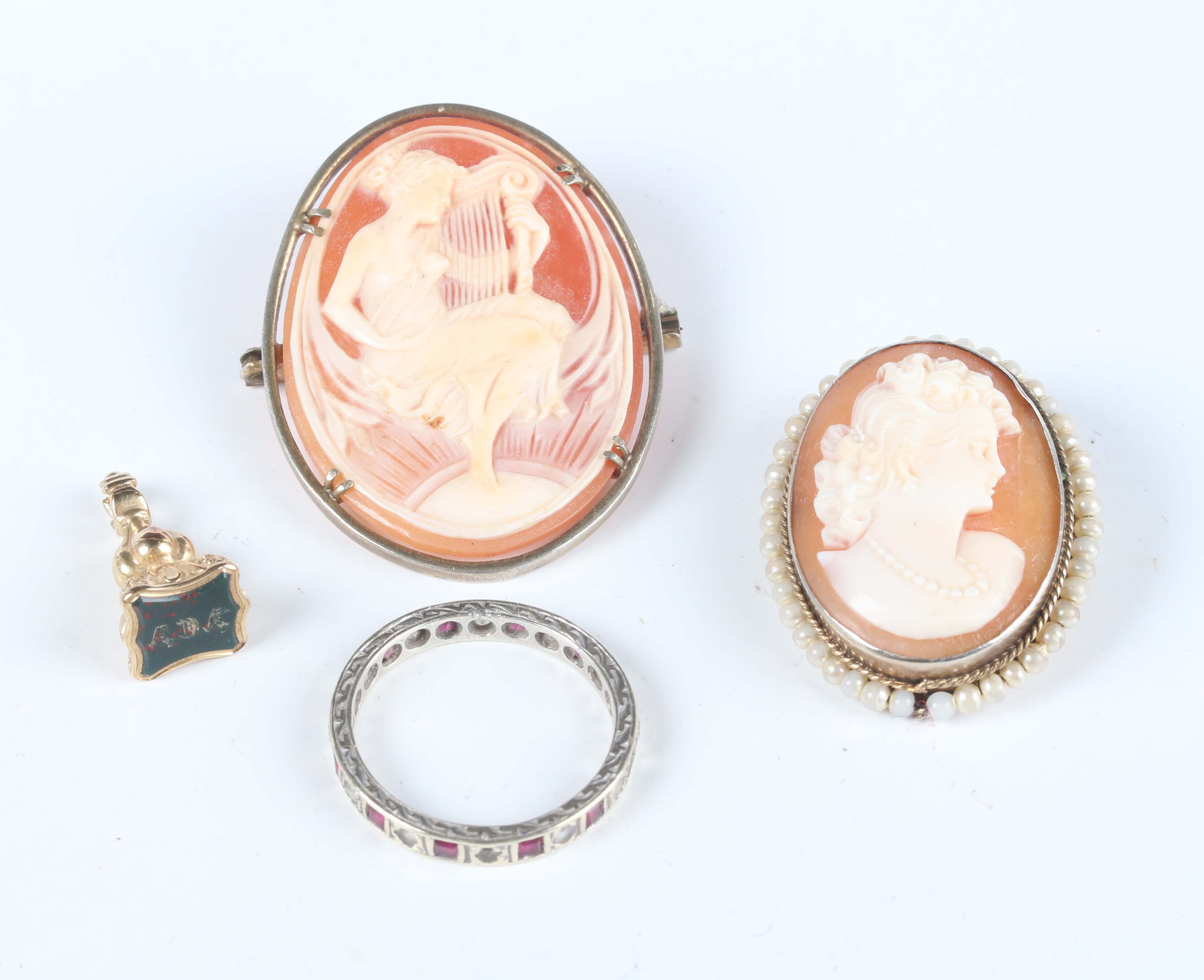 A 9ct white gold synthetic red and colourless gem set ring, weight 2.4g, ring size approx P1/2, a Victorian gold cased and bloodstone set fob seal and two cameo brooches.
