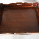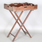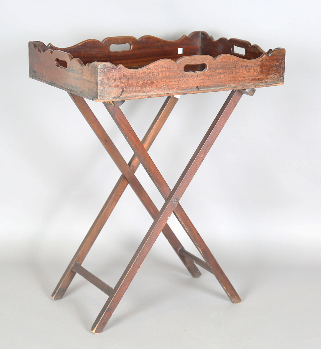 A George III mahogany galleried butler's tray, each side with a pierced handle, 63cm x 48cm, raised on a later folding stand.
