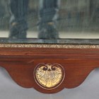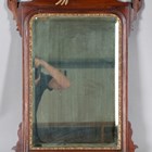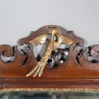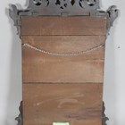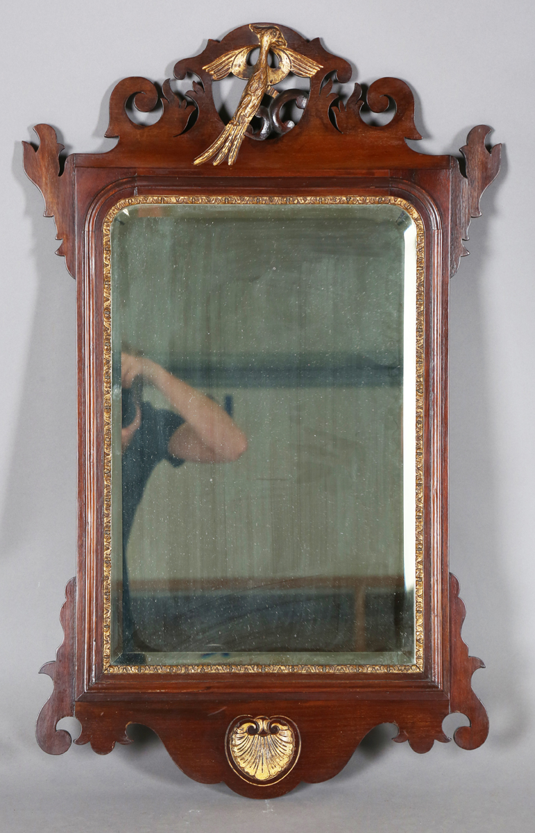 A 20th century George III style mahogany fretwork wall mirror, the parcel gilt and carved phoenix surmount above a bevelled glass plate, 87cm x 54cm.