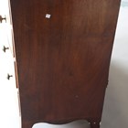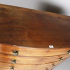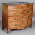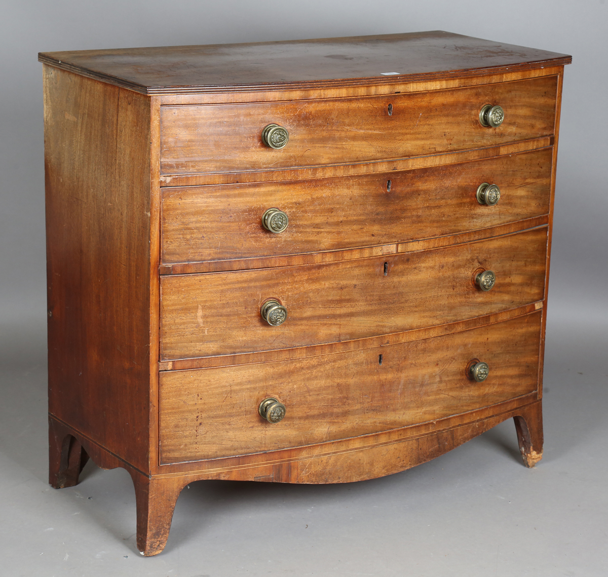 A Regency mahogany bowfront chest of four graduated long drawers, each gilt brass knob embossed with a lion's head, height 100cm, width 110cm, depth 56cm.