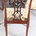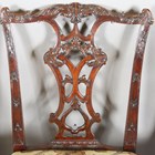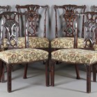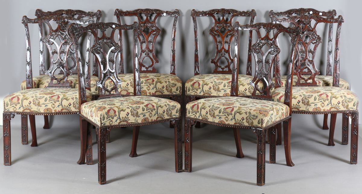 A set of eight early 20th century George III Chippendale style mahogany dining chairs with carved and pierced backs above overstuffed tapestry seats, height 97cm, width 58cm, depth 62cm.
