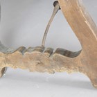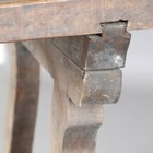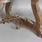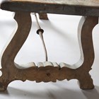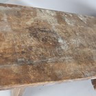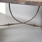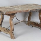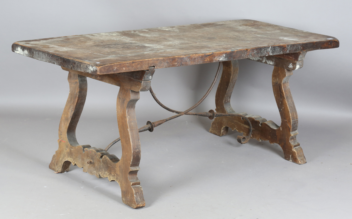 A 20th century Continental fruitwood tavern table, the thick plank top on a pair of trestle supports united by a wrought iron stretcher, height 75cm, length 180cm, depth 79cm.