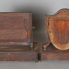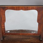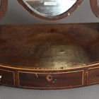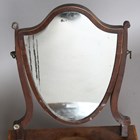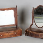 A George III mahogany swing frame mirror with a bowfront base, fitted with three drawers, height 50cm, width 38cm, together with another George III mahogany swing frame mirror, height 50cm, width 48cm.