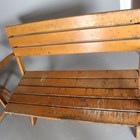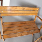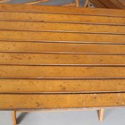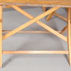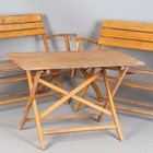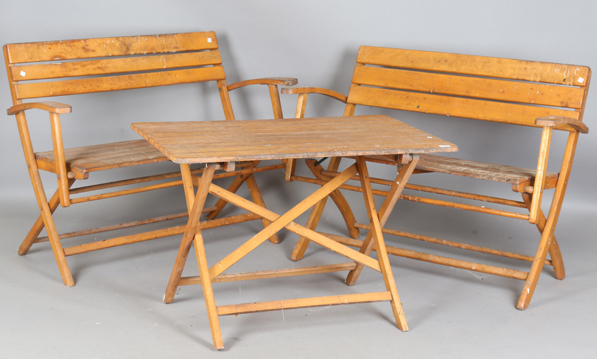 A mid-20th century slatted wooden folding garden table and two matching benches, by Herlag, width of benches 115cm.