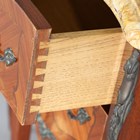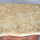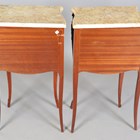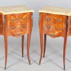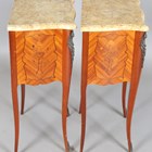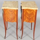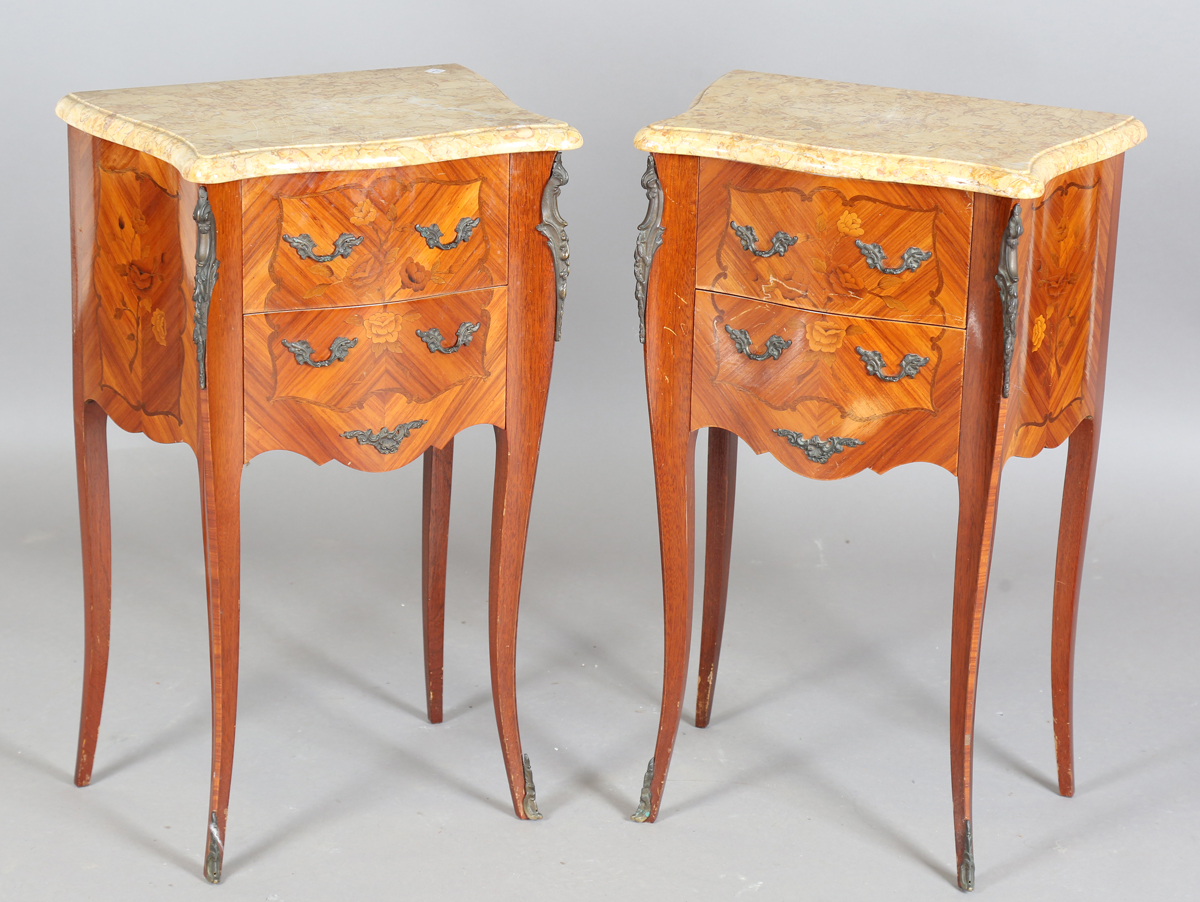 A pair of late 20th century French kingwood and floral marquetry two-drawer bedside chests with shaped marble tops, height 73cm, width 45.5cm, depth 31cm.