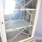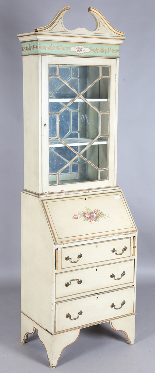 An early 20th century cream and floral painted narrow bureau bookcase, height 207cm, width 62cm, depth 42cm.