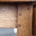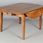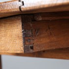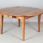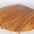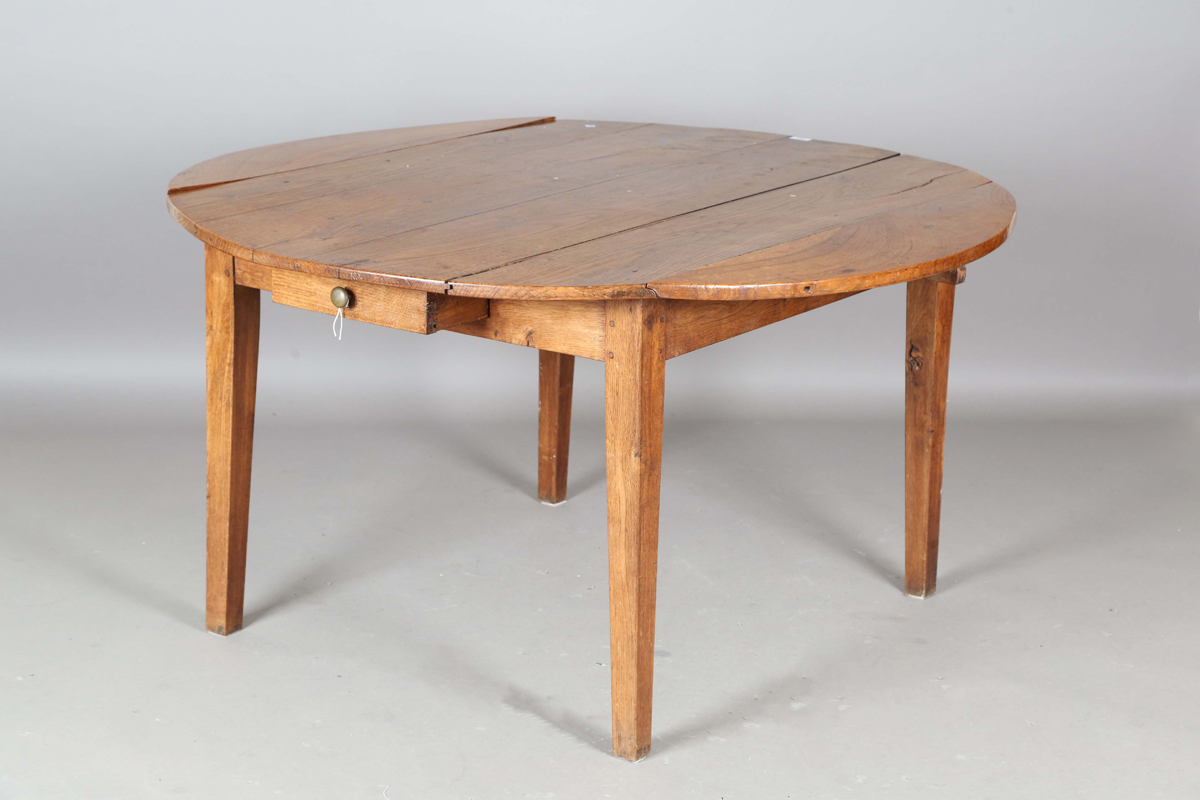 A 19th century French provincial oak circular drop-flap farmhouse table, on block legs, height 74cm, length 138cm, depth 136cm.