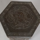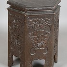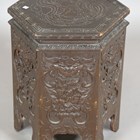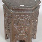 An early 20th century South-east Asian carved and stained softwood hexagonal occasional table, carved in relief with overall dragons, height 54cm, width 43cm.