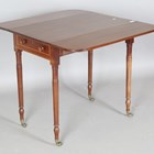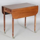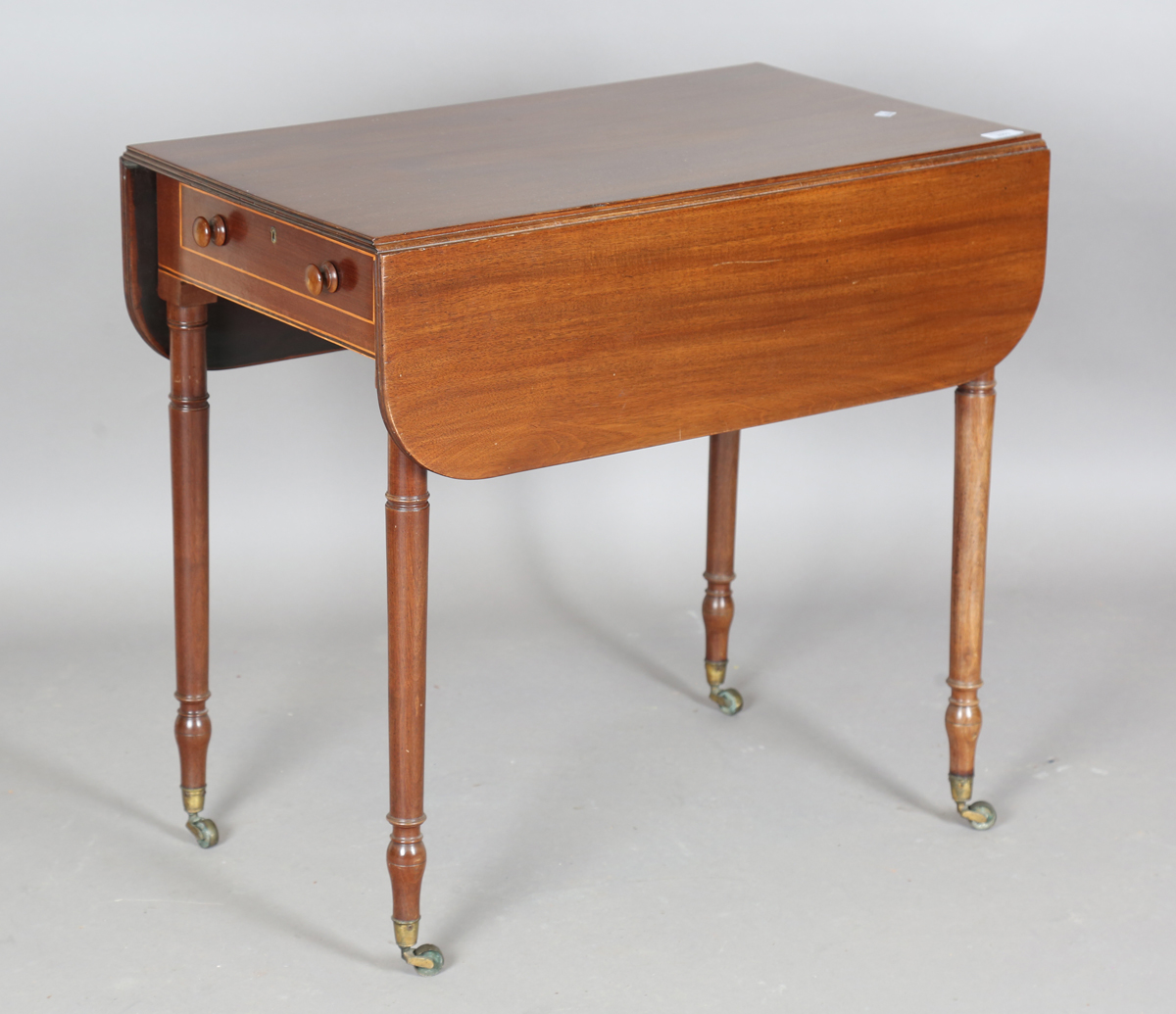 A Regency mahogany Pembroke table with boxwood stringing, on ring turned legs and castors, height 70cm, extended width 88cm, depth 76cm.