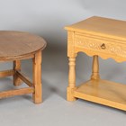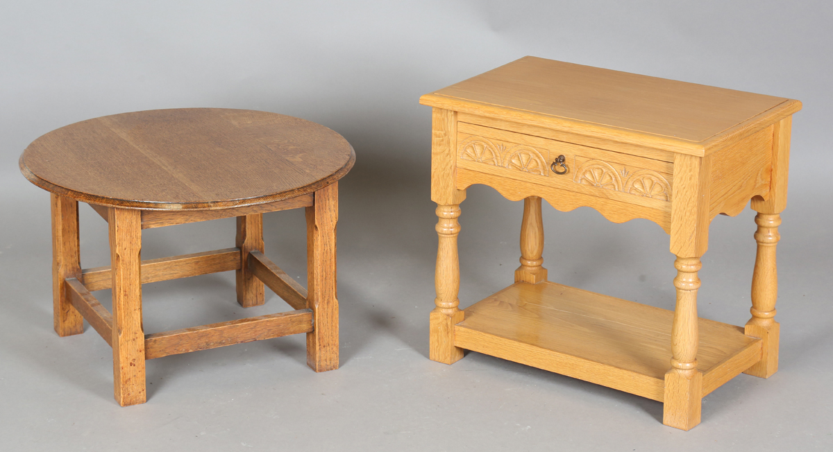 A modern oak side table, fitted with a single drawer, height 51cm, width 55cm, depth 36cm, together with a small oak occasional table, height 38cm, diameter 59cm.