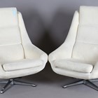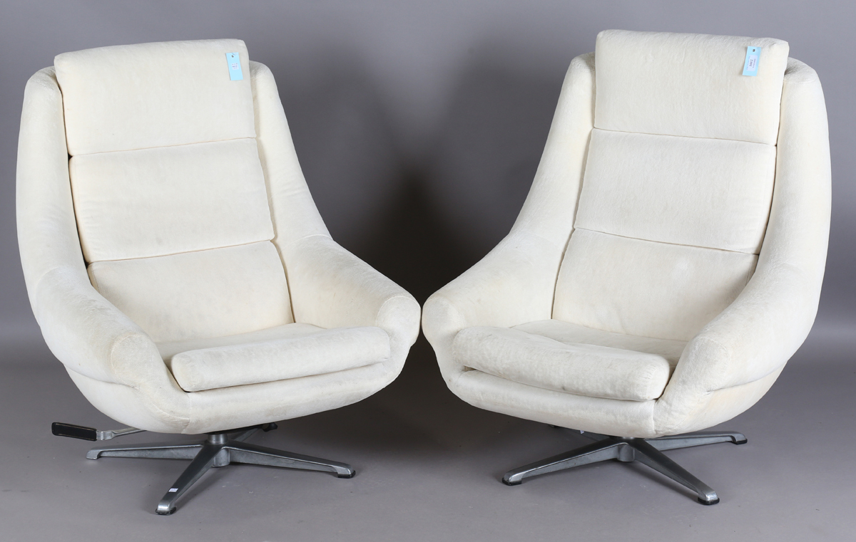 A pair of mid-20th century Scandinavian revolving lounge chairs of tub form, raised on aluminium bases, height 100cm, width 82cm, depth 86cm.