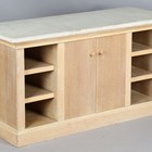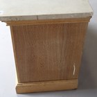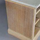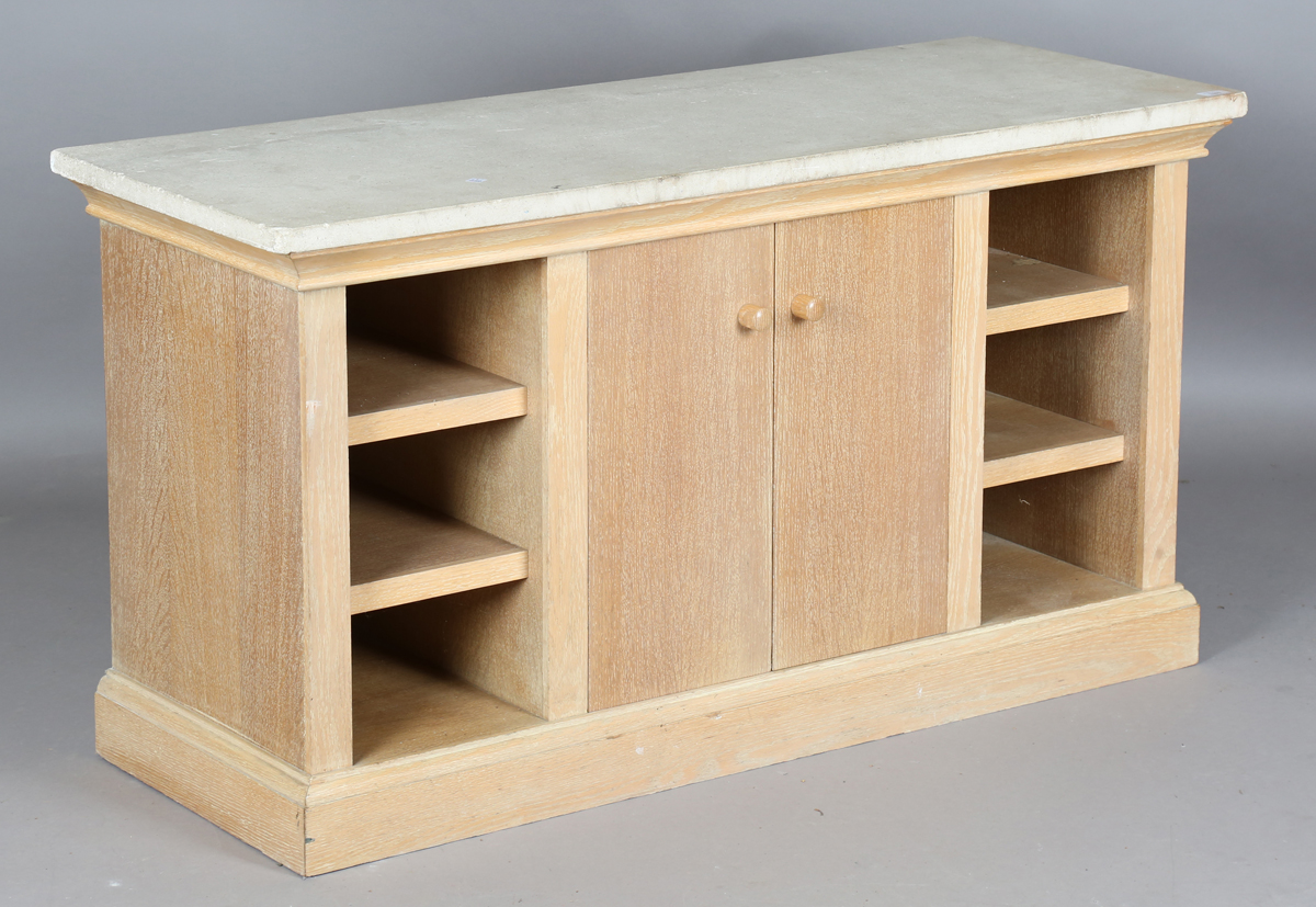A modern oak side unit, the limestone top above two doors flanked by shelves, height 70cm, width 129cm, depth 50cm.