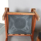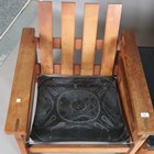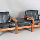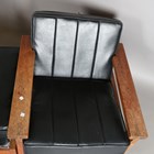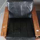 A pair of mid-20th century teak framed lounge chairs with loose leatherette cushions and Pirelli rubber seat supports, height 64cm, width 69cm, depth 74cm, together with a matching stool, height 37cm, width 62cm, depth 62cm.