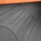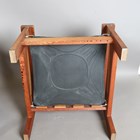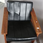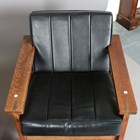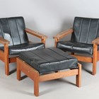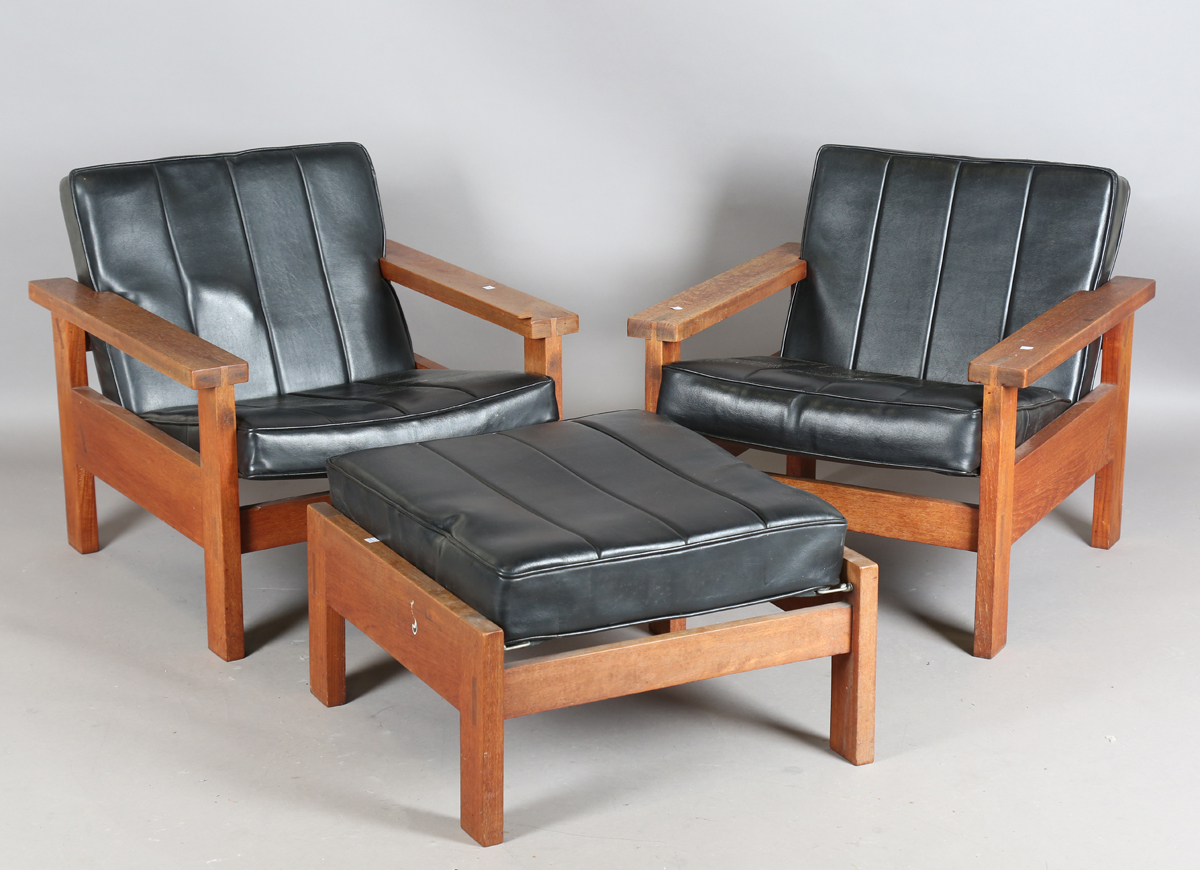 A pair of mid-20th century teak framed lounge chairs with loose leatherette cushions and Pirelli rubber seat supports, height 64cm, width 69cm, depth 74cm, together with a matching stool, height 37cm, width 62cm, depth 62cm.