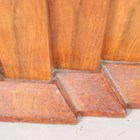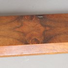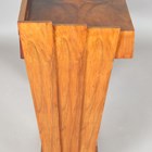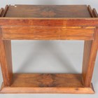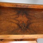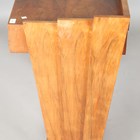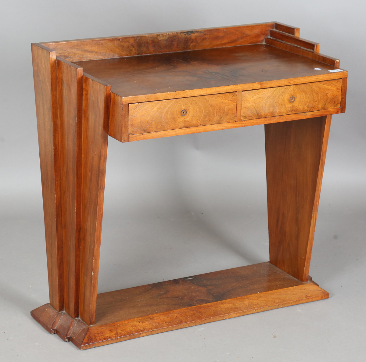 An Art Deco walnut writing table with an angular gallery and two frieze drawers above a stepped platform base, height 80cm, width 82cm, depth 45cm.