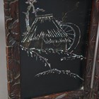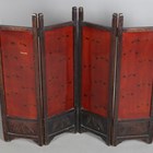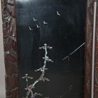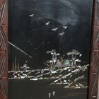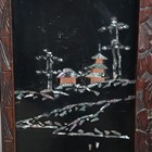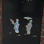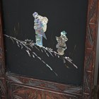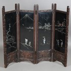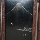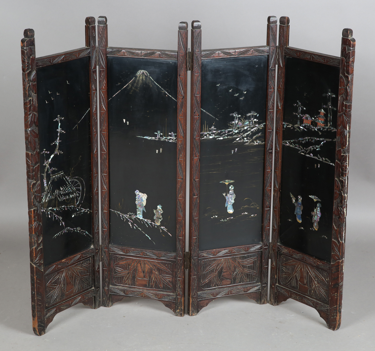 A Japanese black lacquer and softwood framed four-fold screen, inlaid in mother-of-pearl with a continuous landscape scene of Mount Fuji, height 91cm, width 108cm.
