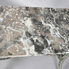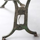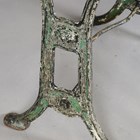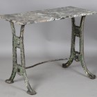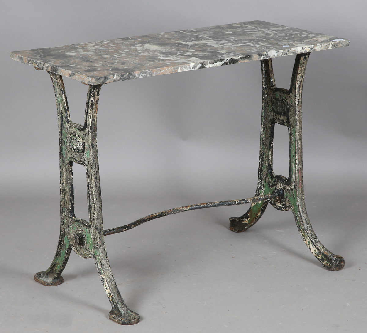 A 19th century cast iron and marble-topped rectangular garden table, the shaped supports raised on castors, height 71cm, width 92cm, depth 43.5cm.