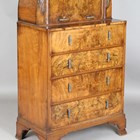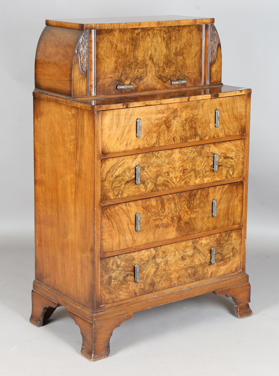An Art Deco walnut chest, the shaped top fitted with a compartment above four drawers, height 136cm, width 91cm, depth 50cm.