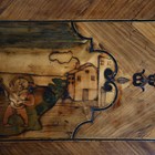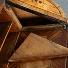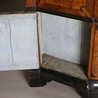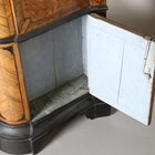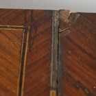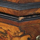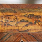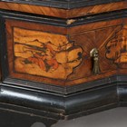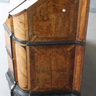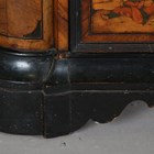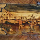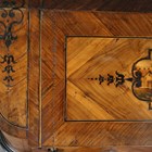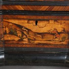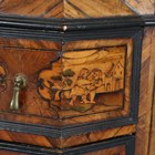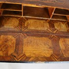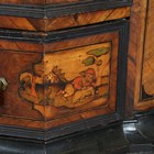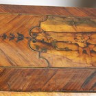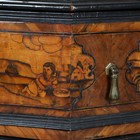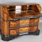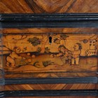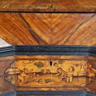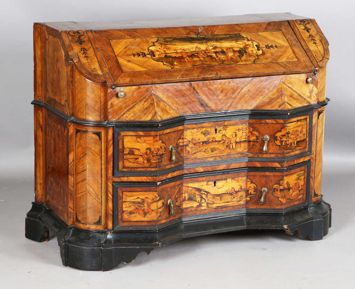An 18th century North Italian walnut and marquetry inlaid bureau, the top, fall flap and two drawers inlaid with landscape scenes depicting figures involved in rural pursuits, all within ebonized borders, height 101cm, width 133cm, depth 62cm.