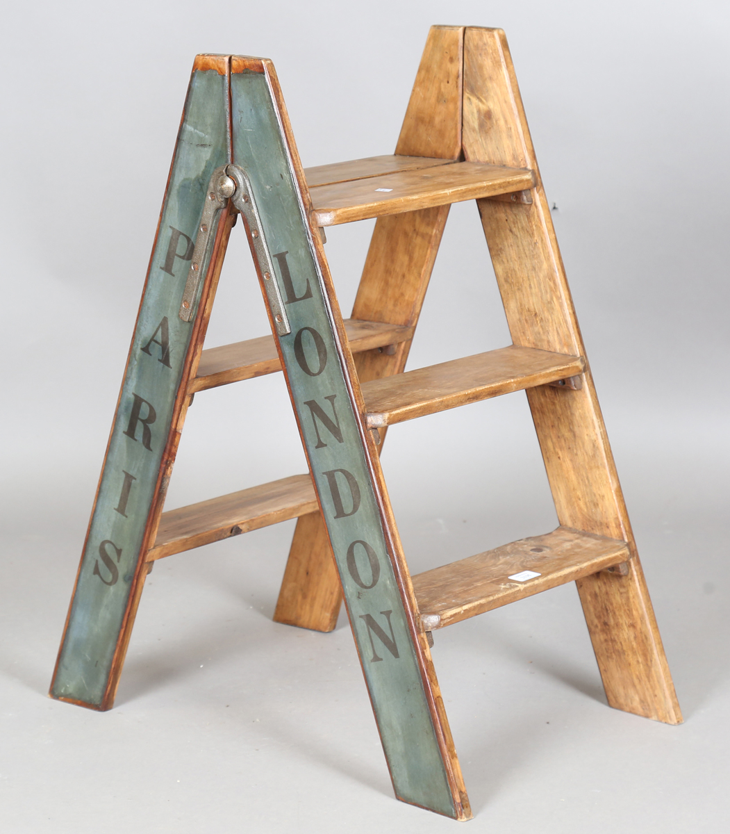 A set of modern folding library steps, the sides inscribed with four capital cities, height 82cm, width 43cm.