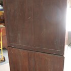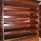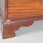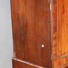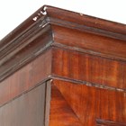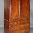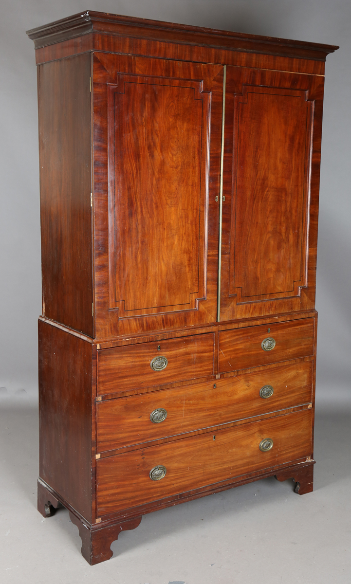 A George IV mahogany linen press, the doors inlaid with an ebony line border, enclosing sliding trays above oak-lined drawers, height 217cm, width 128cm, depth 58cm.