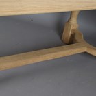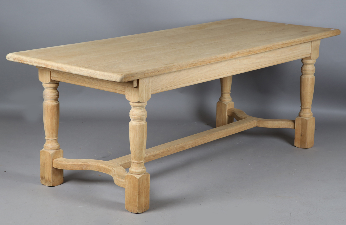 A 20th century stripped oak refectory style dining table, on turned and block legs united by a shaped 'H' stretcher, height 76cm, length 210cm, depth 83cm.