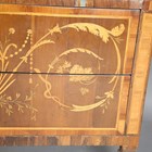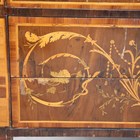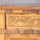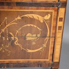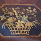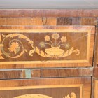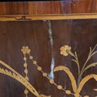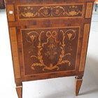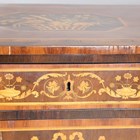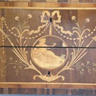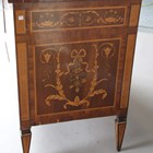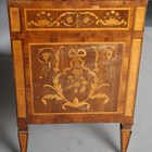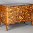 A pair of late 18th century North Italian kingwood, walnut and floral marquetry three-drawer commodes, in the manner of Giuseppe Maggiolini, each top inlaid with a basket of flowers, the fronts with central figural reserves supported by scrolling tendrils ending in curling leaves, raised on square tapering legs, height 90cm, width 124cm, depth 58.5cm.