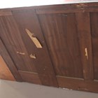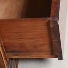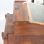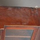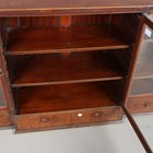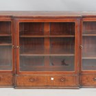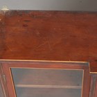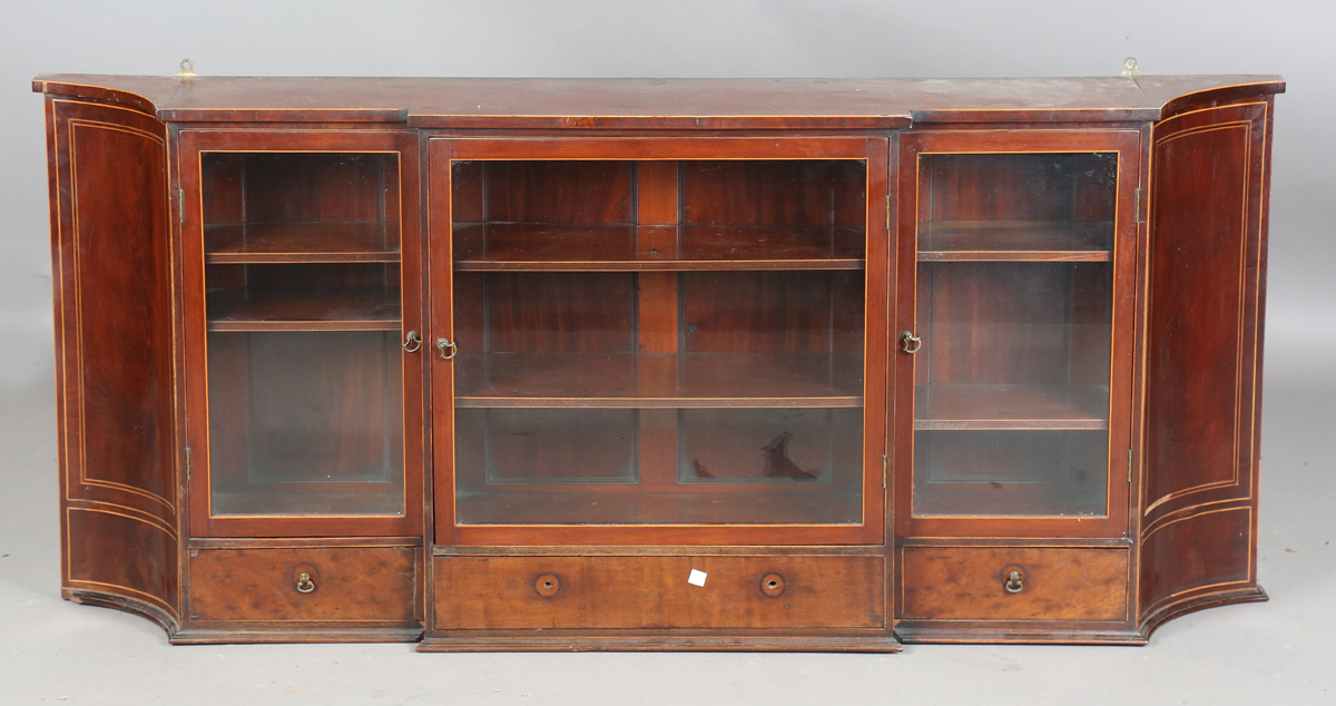 A 19th century mahogany and boxwood strung hanging display cabinet, fitted with four glazed doors and two drawers, height 65cm, width 150cm, depth 25cm (faults).