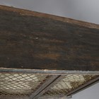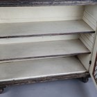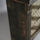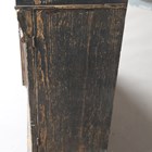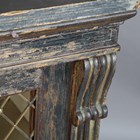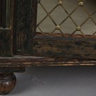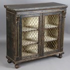 A Regency painted softwood side cabinet, in the manner of Gillows of Lancaster, the two doors inset with gilt brass lattice panels, the surface with remnants of painted line detail, height 96cm, width 99cm, depth 41cm.
