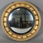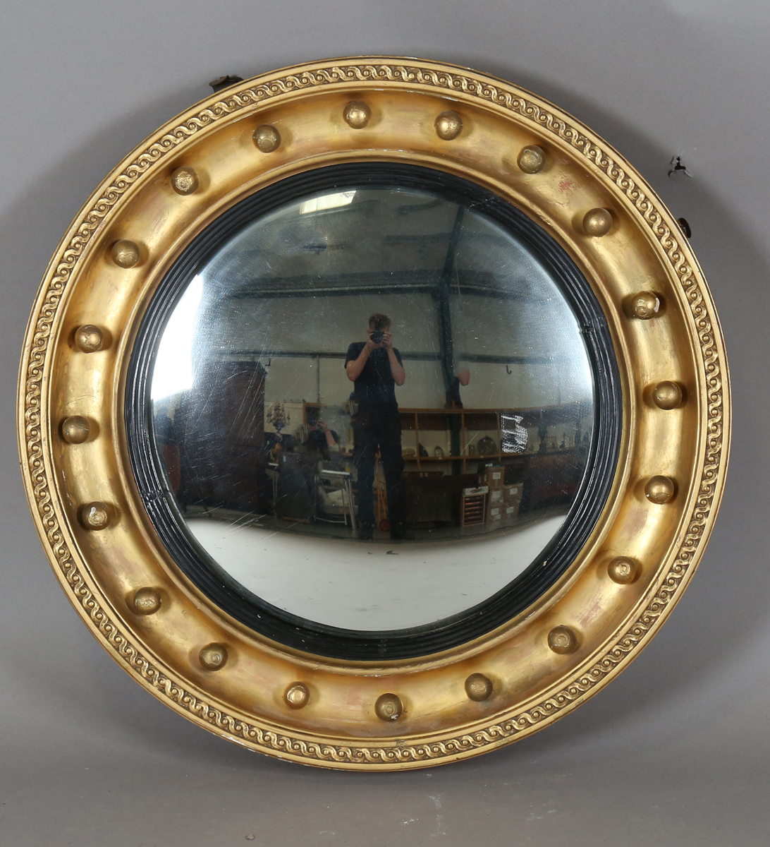 An early 20th century Regency style gilt gesso convex wall mirror, the guilloche moulded frame with a border of applied ballshots, diameter 54cm.