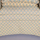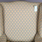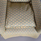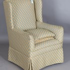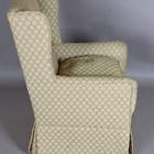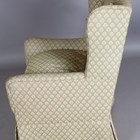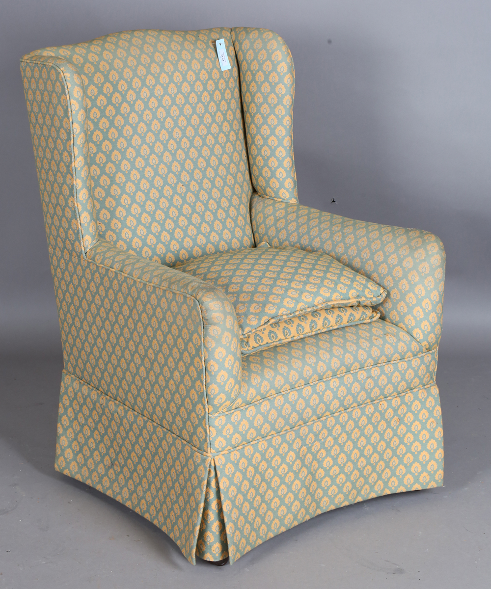 An Edwardian wing back armchair, upholstered in green and yellow patterned damask, height 99cm, width 64cm, depth 74cm.