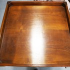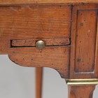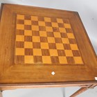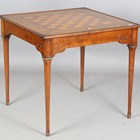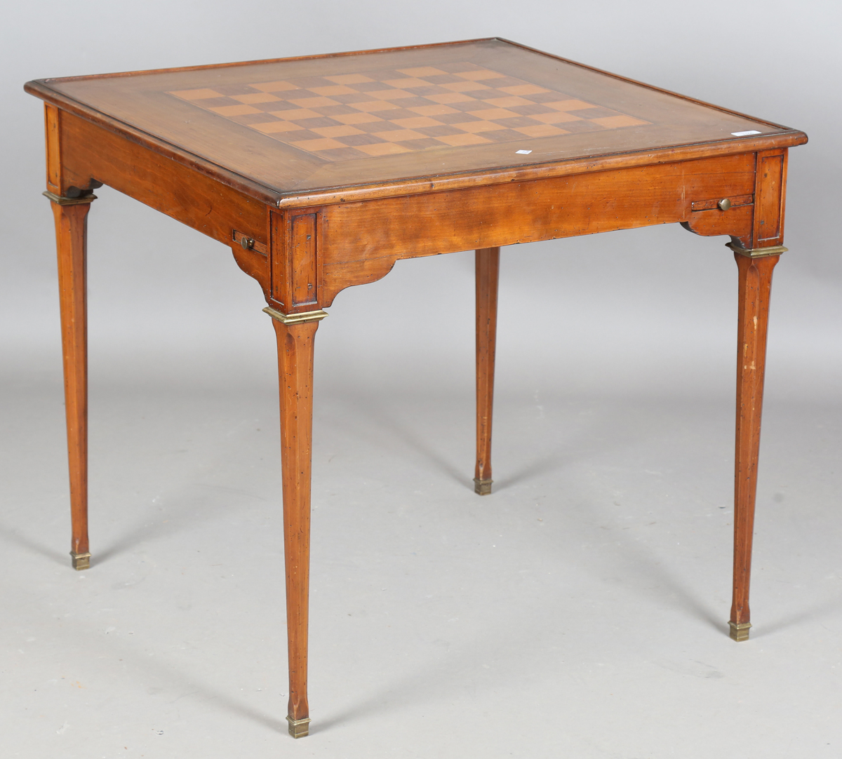 A 20th century French cherry games table, the reversible top inlaid with a chessboard and inset with baize, the square tapering legs with gilt brass mounts, height 72cm, width 78cm, depth 78cm.