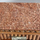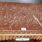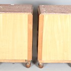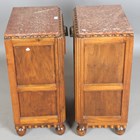 A pair of French Art Deco walnut bedside cabinets with pink marble tops, height 74cm, width 50cm, depth 35cm.